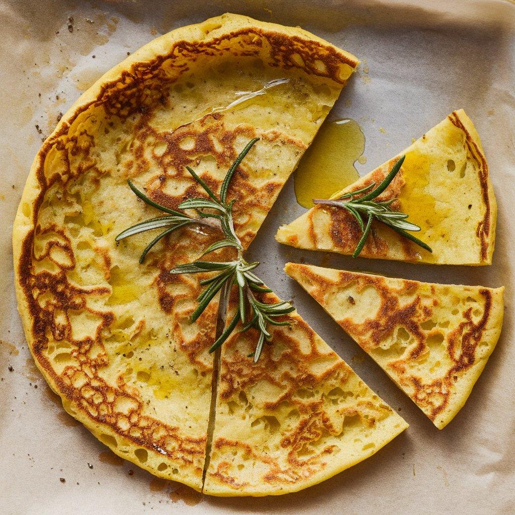 Socca has a crispy, golden exterior and a soft, slightly creamy interior. Its flavor is savory and nutty, with the chickpea flour providing a unique depth complemented by a drizzle of olive oil and a sprinkle of black pepper.