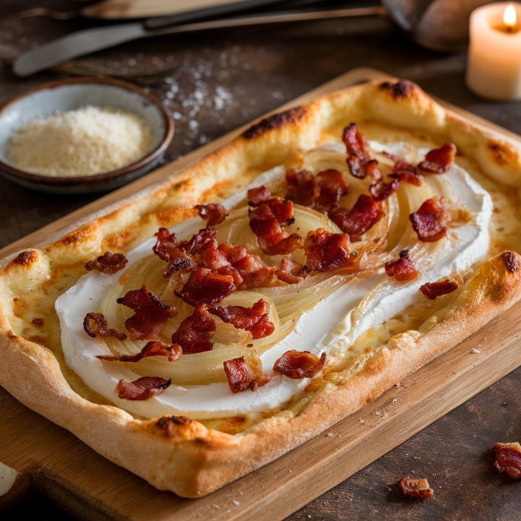 Tarte Flambée, also known as “Flammekueche,” is a specialty from the Alsace region in France. It’s a thin, crispy pizza-like dish topped with a mixture of crème fraîche, onions, and bacon (lardons).