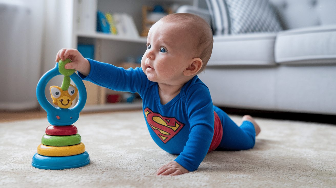 Place a colorful rattle just out of your baby’s reach to encourage them to lift their head and stretch their arms towards it. This activity motivates your baby to strengthen their neck and back muscles while focusing on an object that captures their attention.