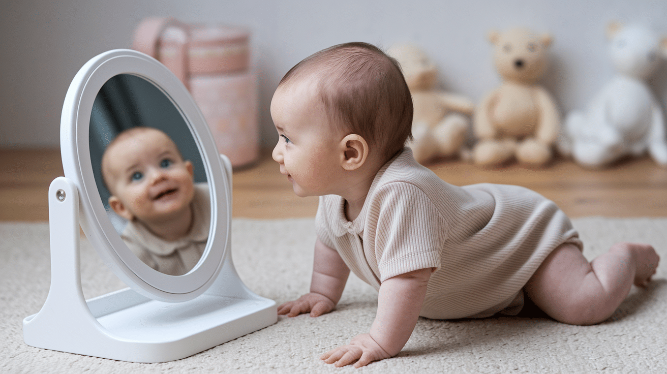 Place a baby-safe mirror in front of your little one during tummy time. Babies love to look at their own reflection and it encourages them to lift their head. It’s fascinating for them to see themselves, which can spark curiosity and improve their visual tracking skills.