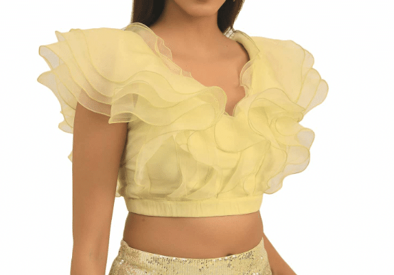 The frill crop top adds a touch of elegance with its decorative fringes and off-shoulder designs.