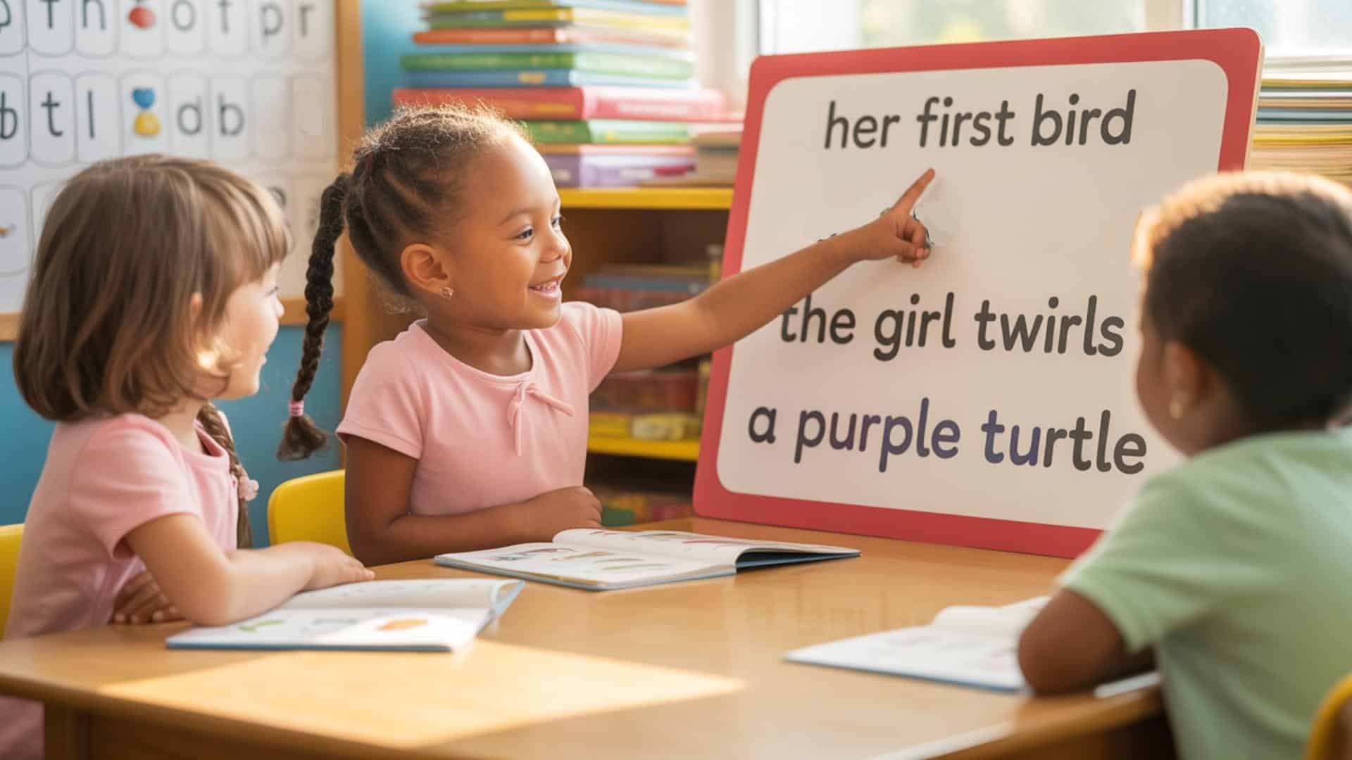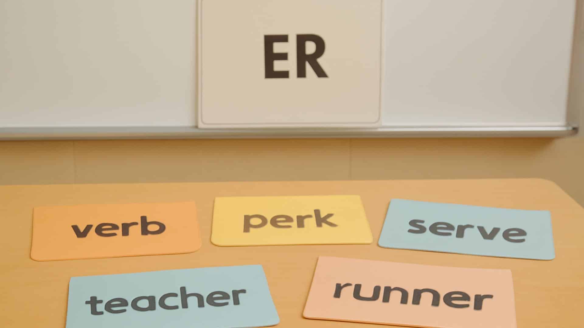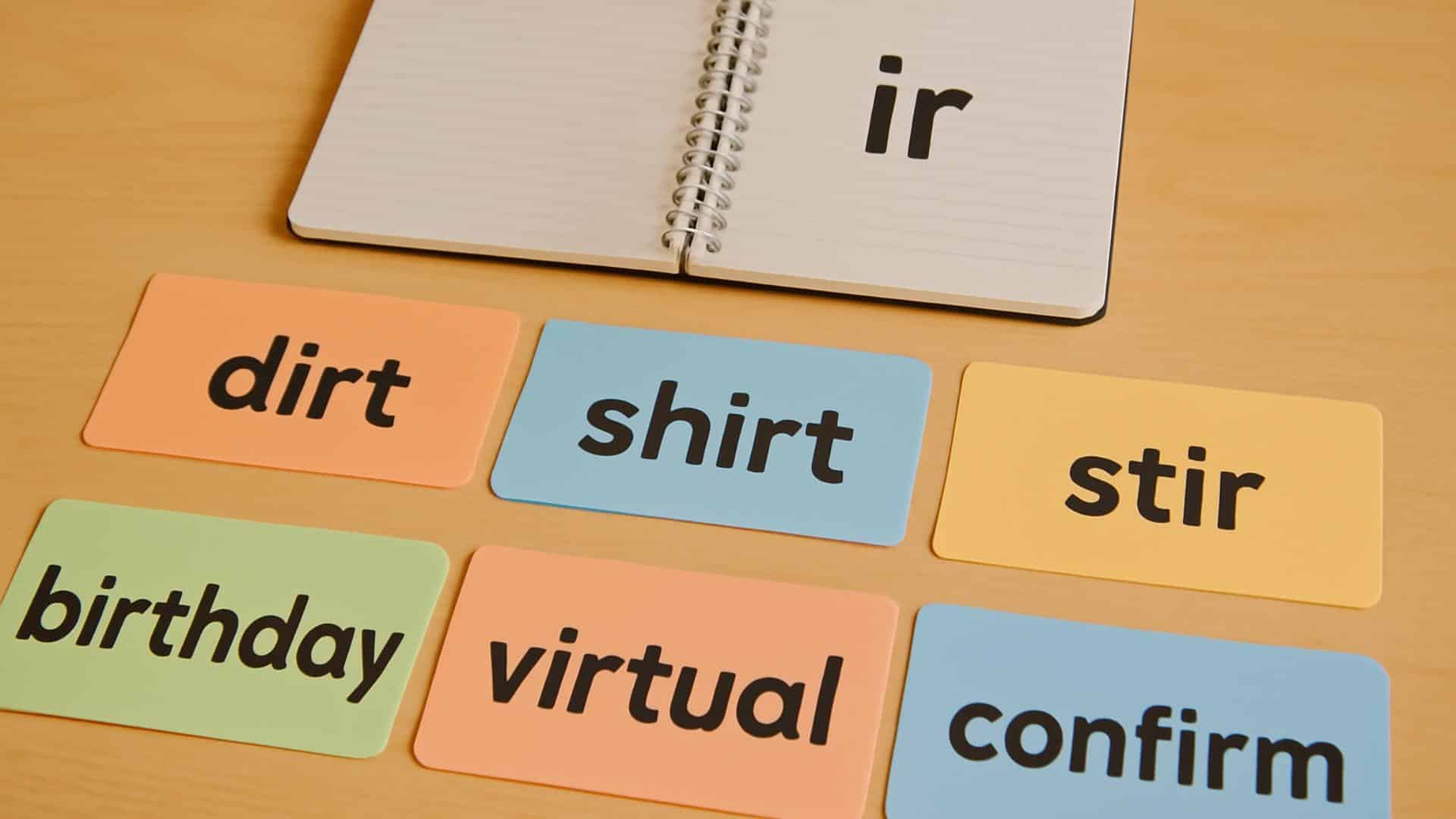 Try using memorable phrases for each sound: “her first bird” (er), “the girl twirls” (ir), and “a purple turtle” (ur).