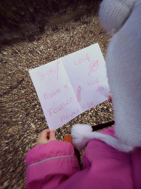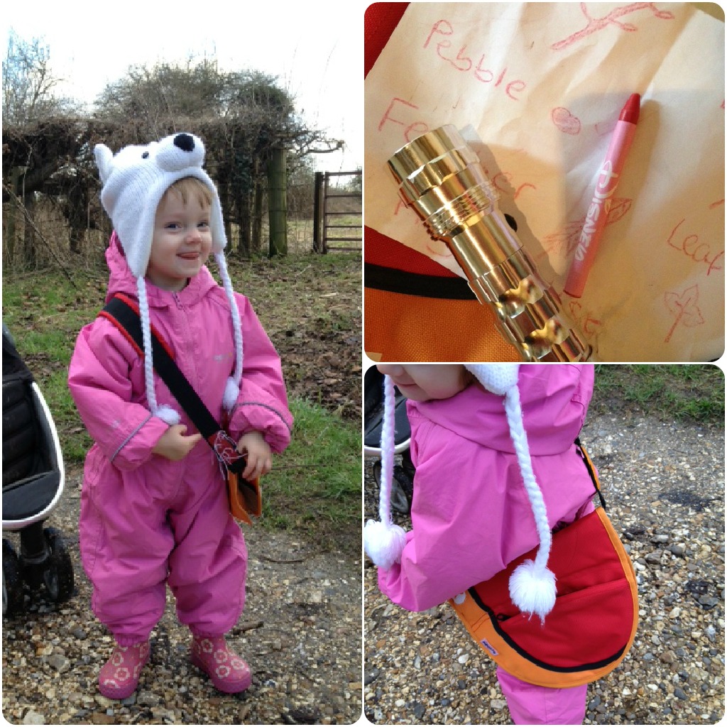 Armed with nothing more than a bag, a torch, a list and a crayon, we set off to find some “treasure”. (It should be noted that nature trails are a great way to con gullible toddlers into thinking sticks and leaves etc are actual treasure. There’s only so long they’ll be happy to rummage around for something that’s not an iPad or the latest One Direction album.)