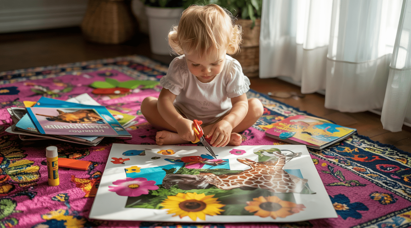 Create composite artwork by cutting and arranging magazine images and text. Children practice scissor skills and composition while expressing ideas through the thoughtful selection and arrangement of pre-existing visual elements.