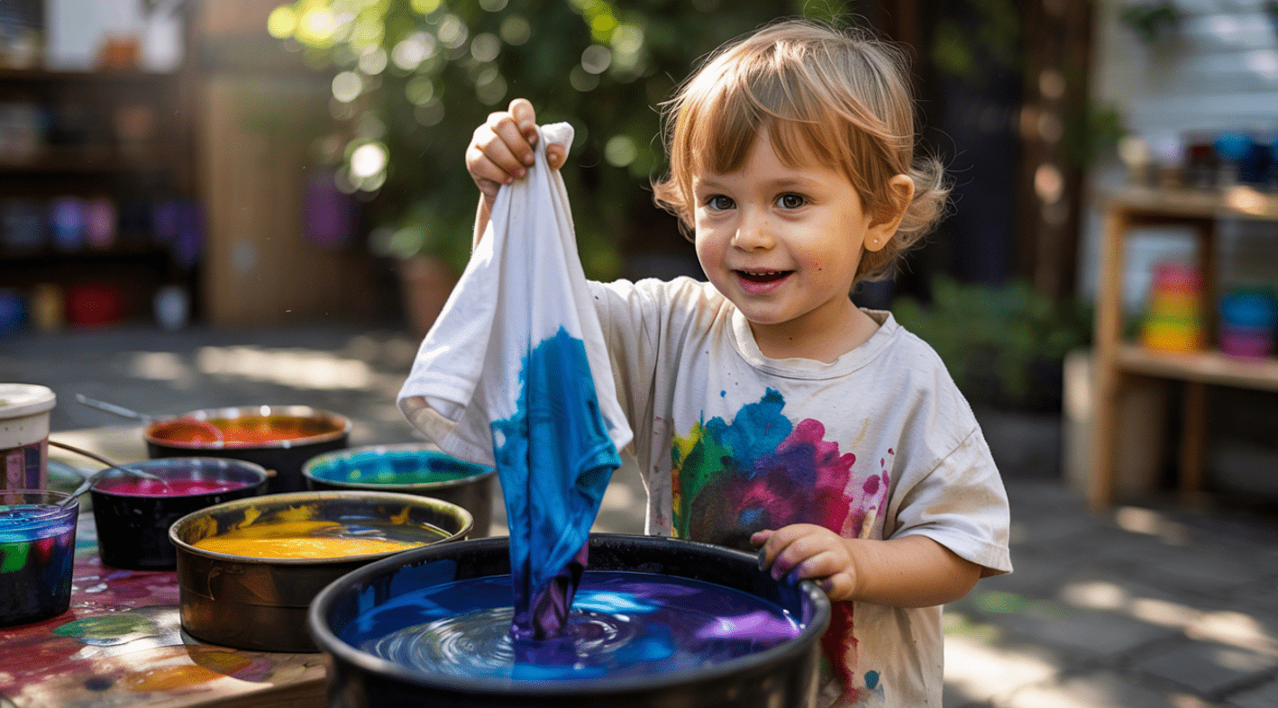 Using fabric dyes, change plain white shirts into colorful wearable art. Children learn about color mixing while creating unique patterns through folding, twisting, and binding techniques before applying dye.