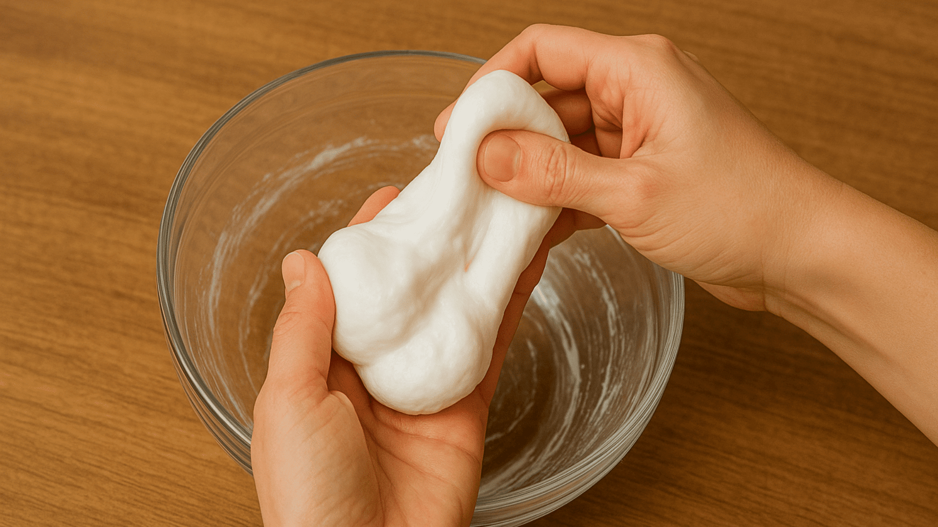 When the slime mixture starts sticking together and pulling away from the bowl’s sides, put down the spoon.