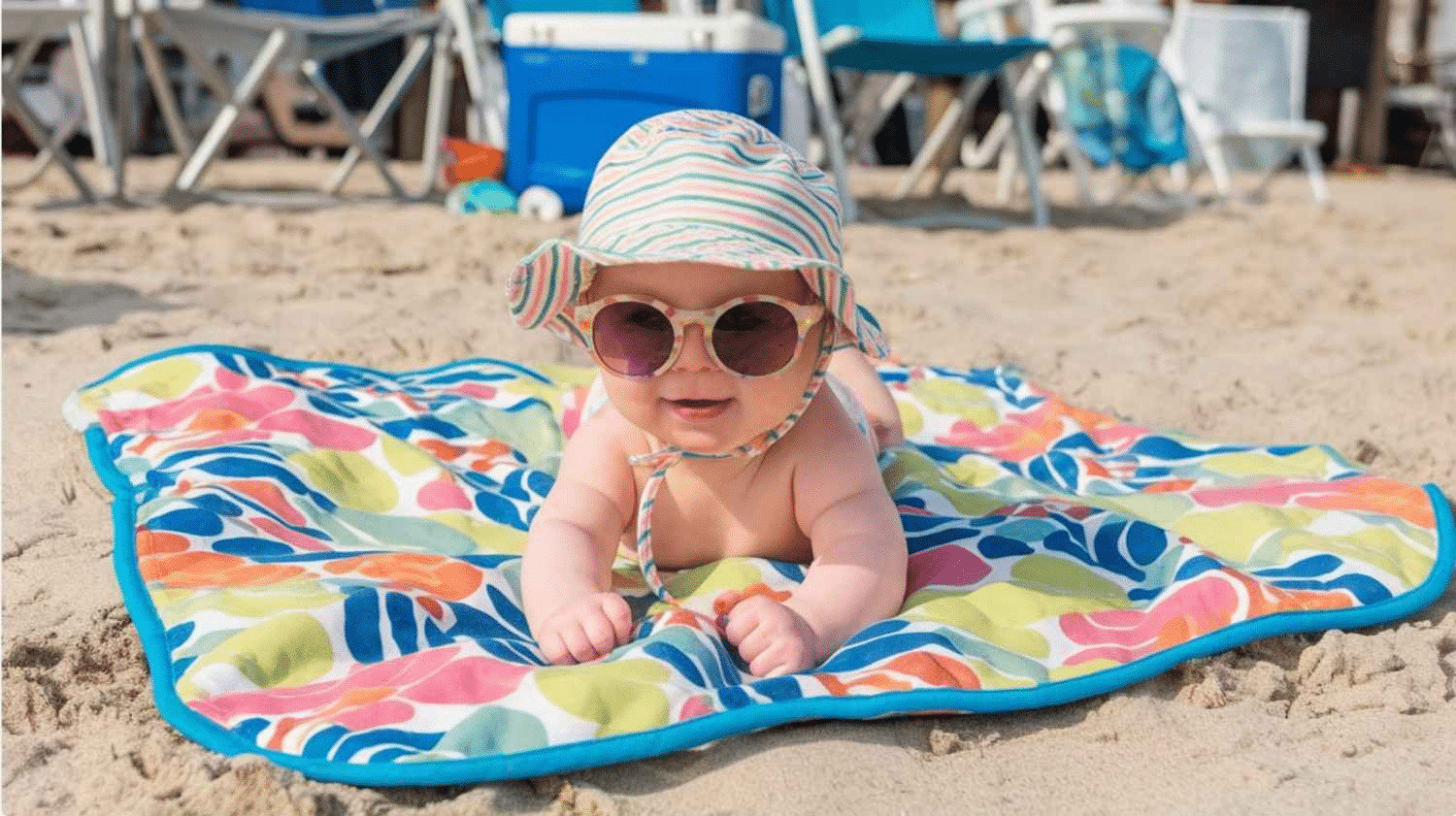 Beach blankets designed for babies feature sand-repelling materials and stakes to secure corners on windy days.