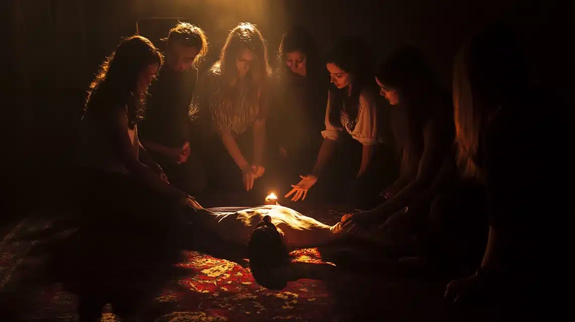 - The group starts chanting “Light as a feather, stiff as a board” slowly together