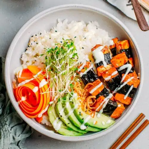 Sushi bowls serve sushi rice and other ingredients in a bowl form, often topped with fish, vegetables, and sauces.