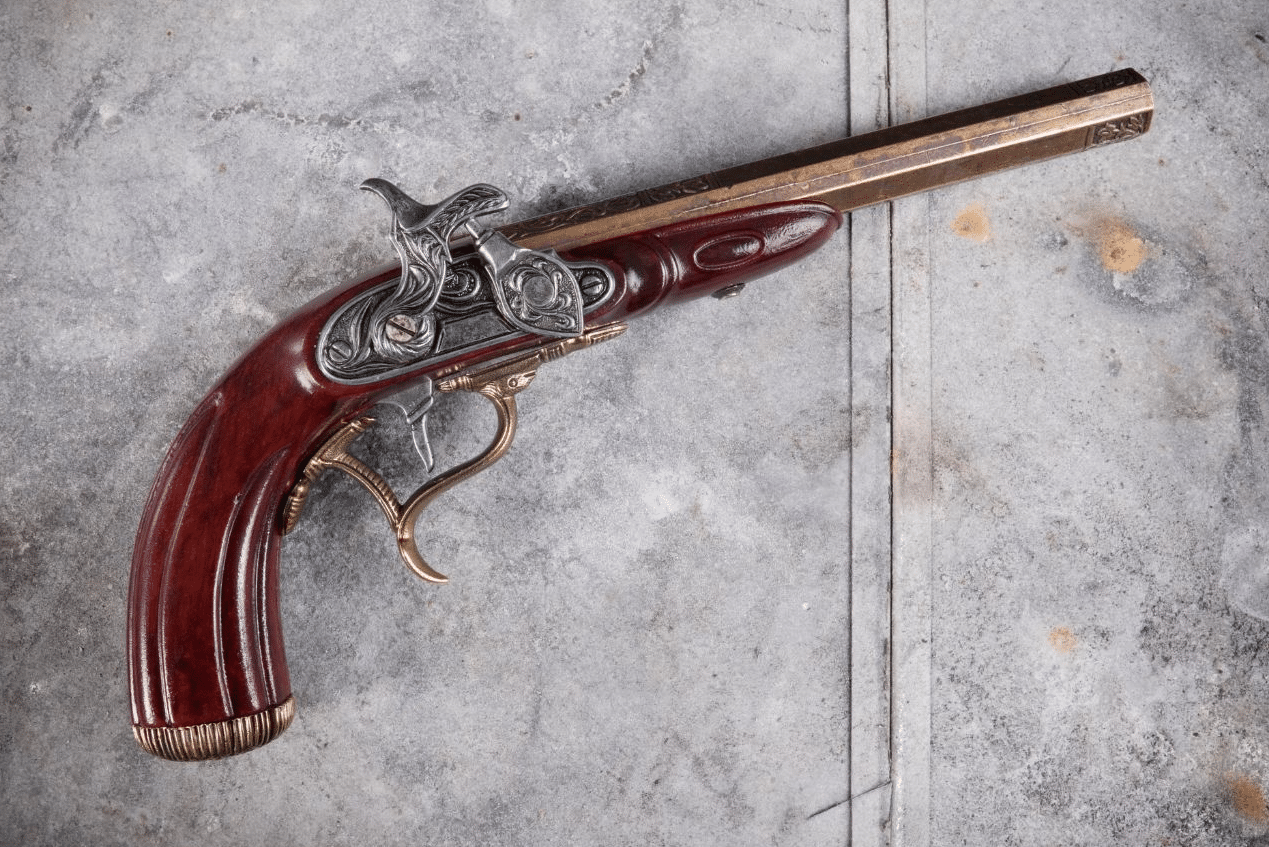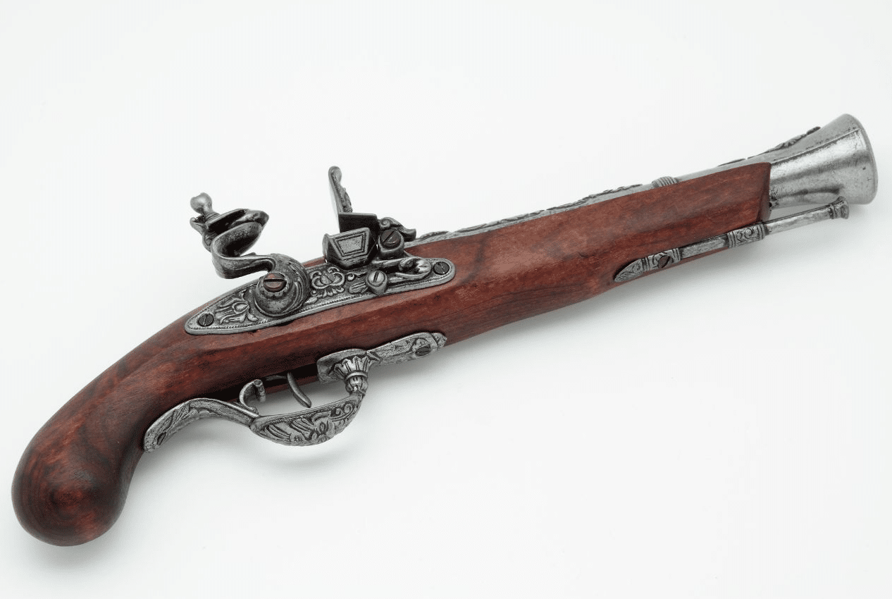 A flintlock pistol is an early type of firearm that uses a flint striking mechanism to ignite the gunpowder.
