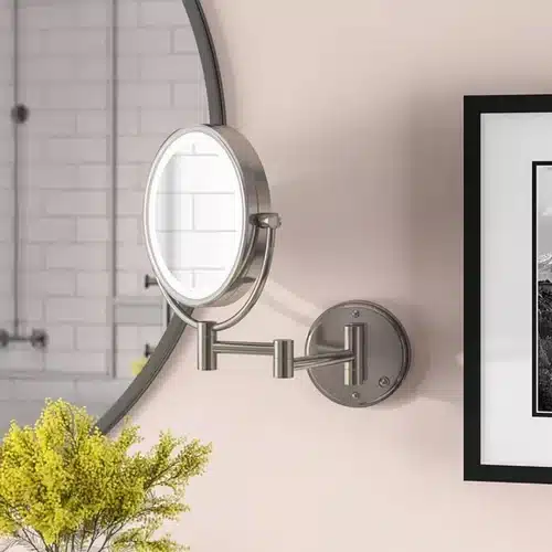 They often feature magnification and may be mounted on an adjustable arm for easy use in the bathroom.