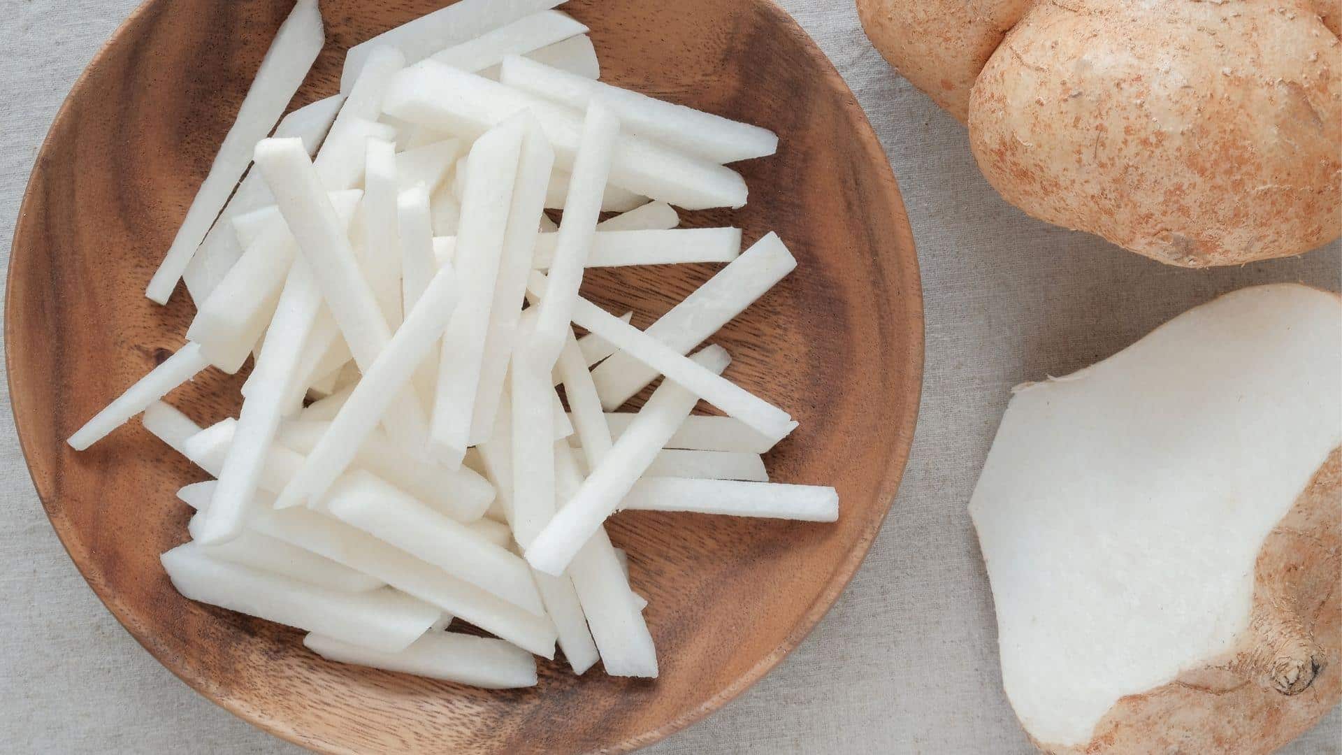Yam bean, also known as jicama, is a root vegetable with a crisp, juicy texture and a mild, slightly sweet flavor.