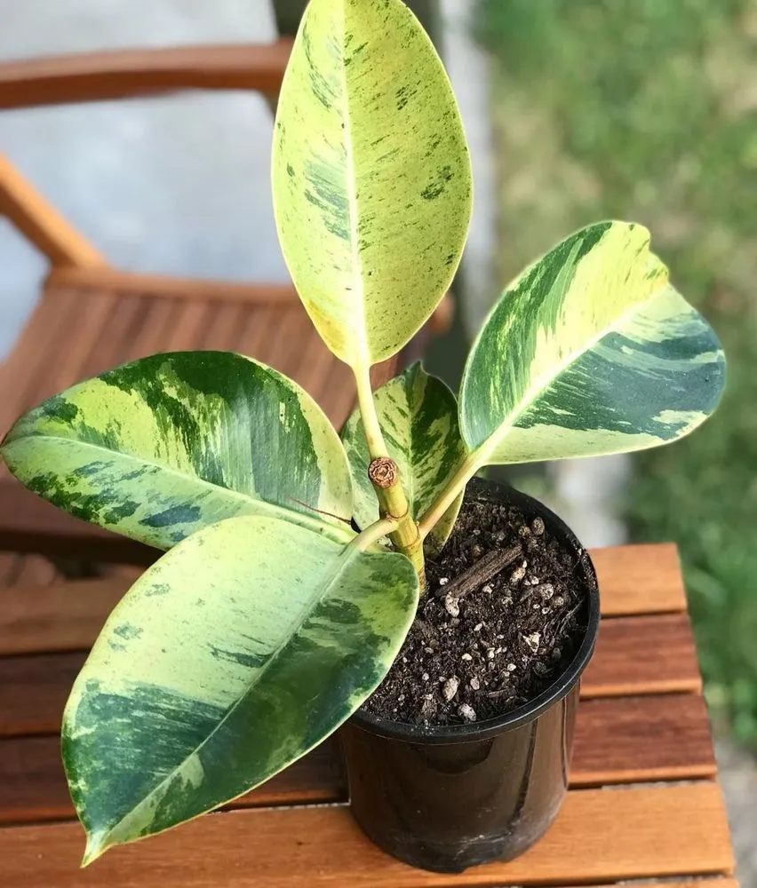 The Tricolor Rubber Plant is prized for its beautifully variegated leaves that feature shades of green, cream, and pink.
