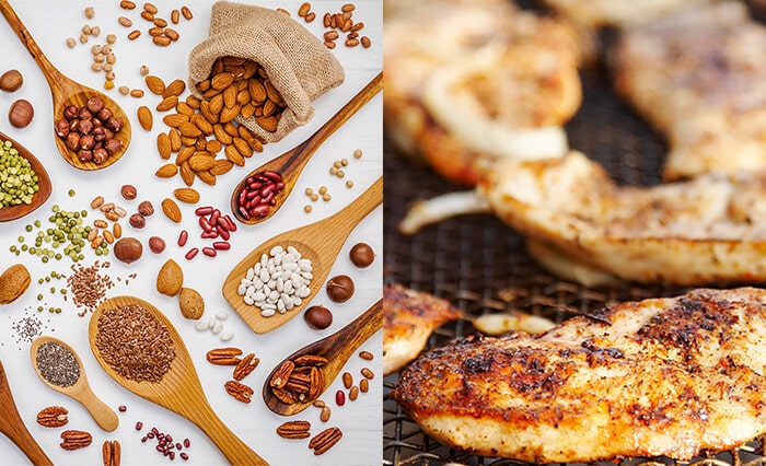 - Chicken breast (23 g protein per 100 g).