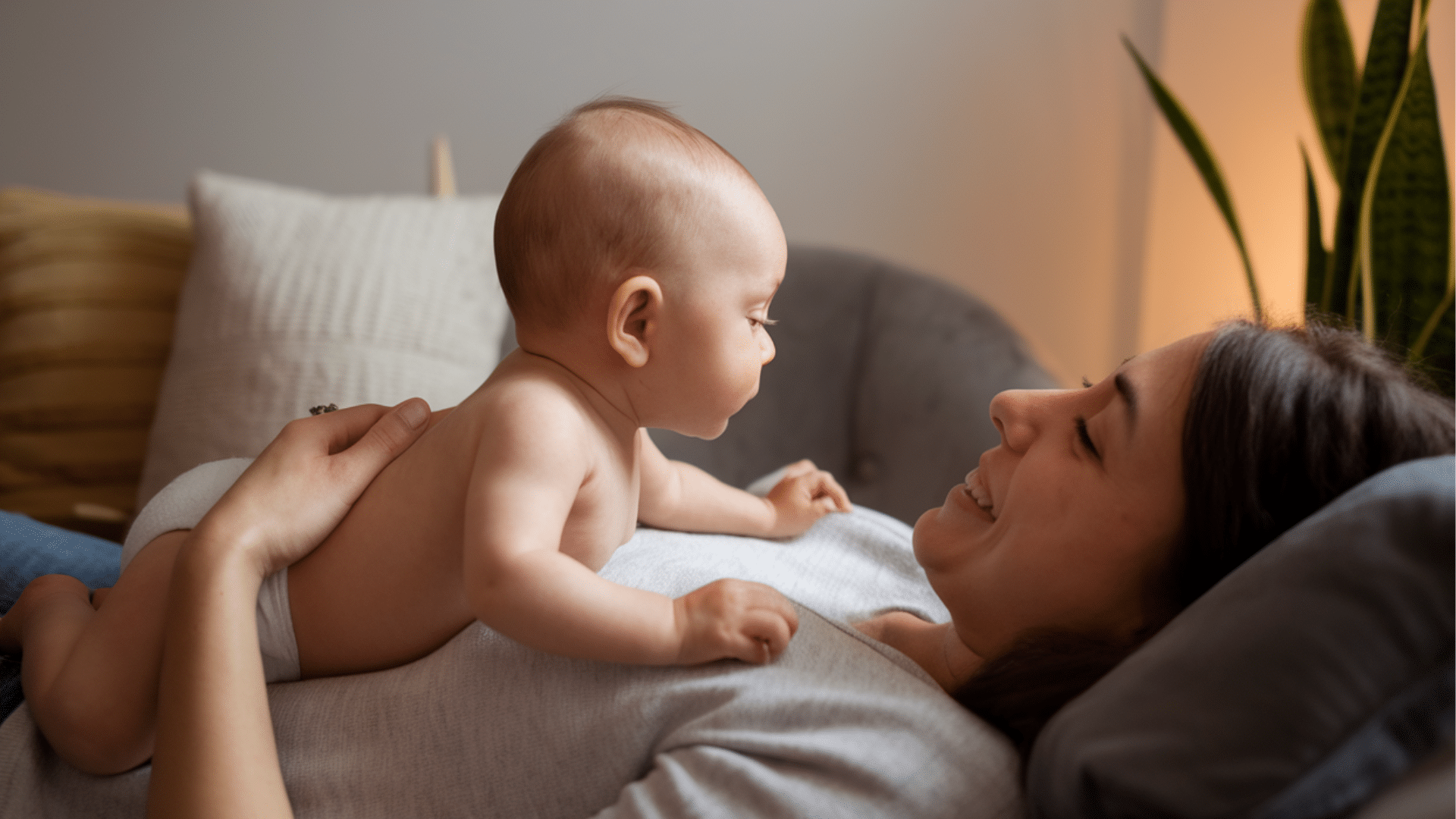 Get down on the floor at eye level with your baby. When you lie down face-to-face with them, you become the most interesting “toy” in the room!
