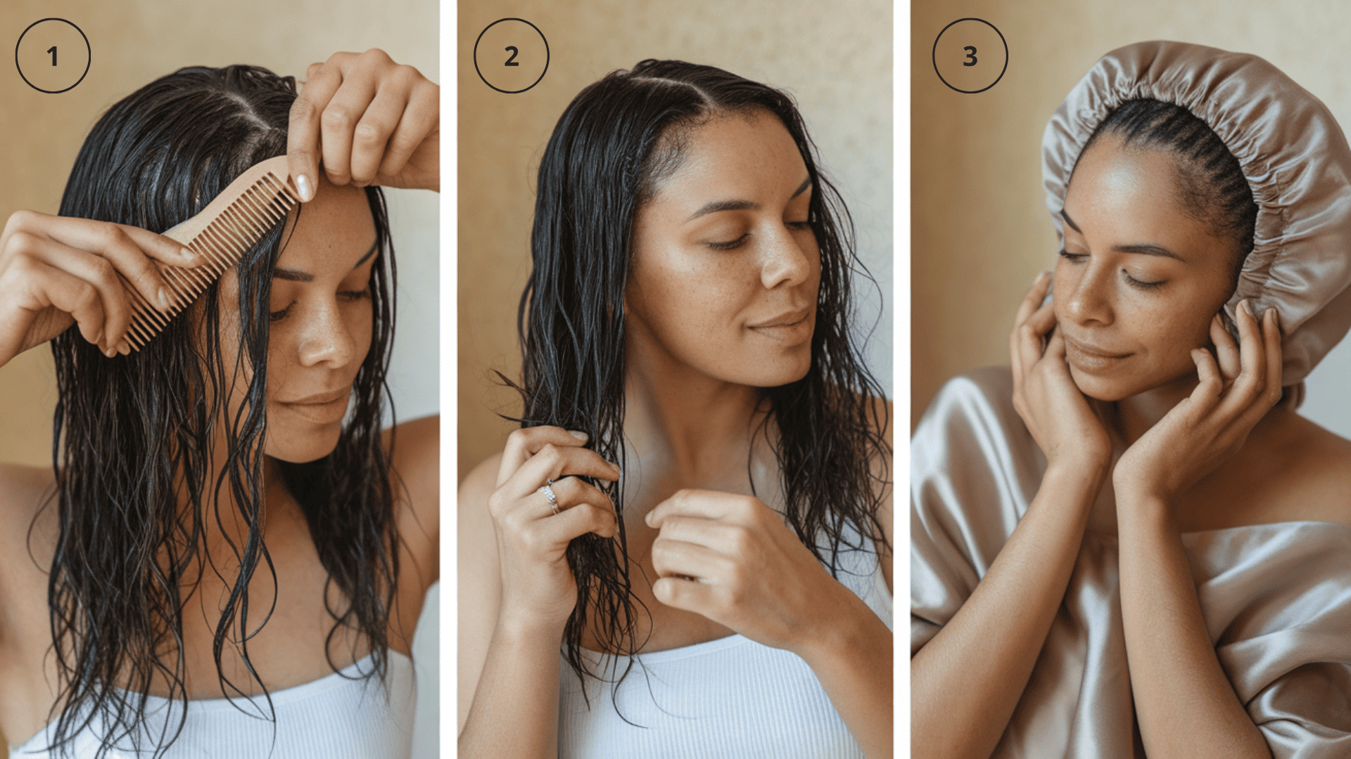 Start by gently detangling your hair. This prevents knots from getting worse overnight and helps distribute your natural oils from root to tip.